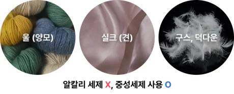 양모(울), 견(실크), 오리털(덕다운), 거위털(구스다운) 등의 소재는 대부분 단백질로 이루어져 있기 때문에, 알칼리성분이 닿으면 단백질이 녹아 손상되어 거칠어지거나 원래의 형태를 유지하지 못하기 때문입니다.