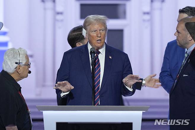 [밀워키=AP/뉴시스] 미국 공화당 대선 후보인 도널드 트럼프 전 대통령이 17일(현지시각) 위스콘신주 밀워키의 피서브 포럼에서 열리는 공화당 전당대회(RNC)를 앞두고 리허설을 하면서 무대를 점검하고 있다. 2024.07.18.