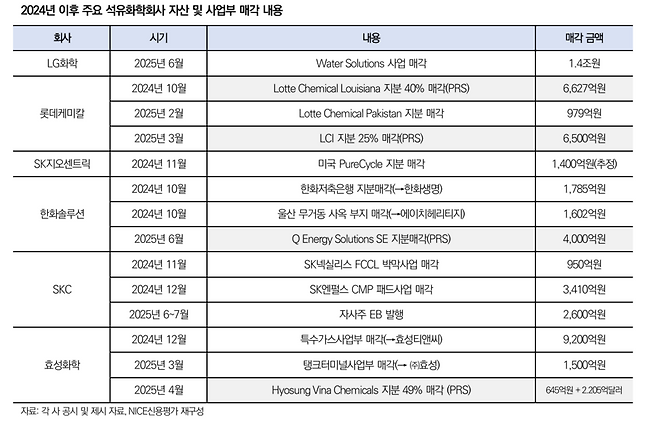 실제로 석유화학사들은 재무 부담을 완화하기 위한 자산 매각을 추진 중이다. 2024년 이후 LG화학, 롯데케미칼, SK지오센트릭, 한화솔루션, SKC, 효성화학 등이 잇따라 매각 작업을 단행하며 대규모 유동성 확보에 나섰다.