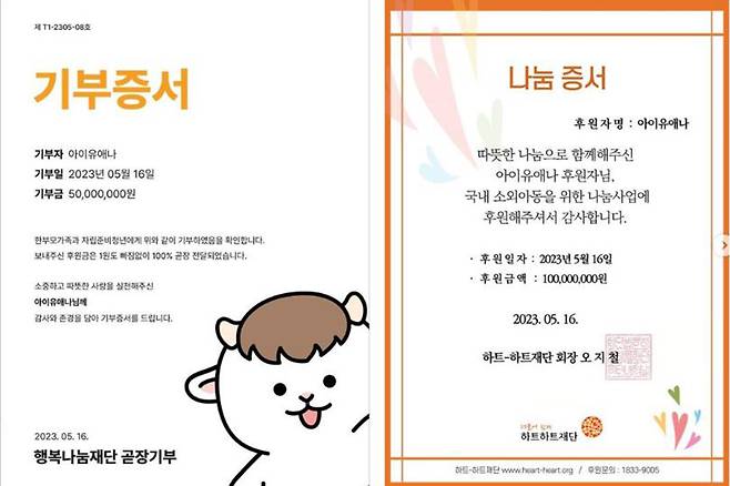 16일 오후 아이유는 자신의 소속사 이담엔터테인먼트를 통해 “유애나(팬클럽)에게 배운 것, 유애나를 통해 느낀 것, 유애나로부터 받은 것들이 언제나 아이유를 움직이는 실천의 재료가 된다. 사랑한다”는 글과 함께 기부 증서를 공개했다.