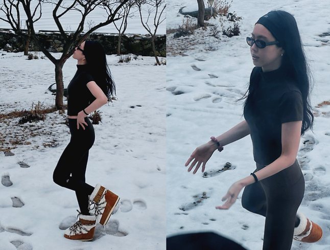 지난 1월 10일, 영하 10도의 매서운 추위 속에서도 손나은은 눈 쌓인 강가에서 반팔 블랙 티와 블랙 레깅스, 어그 부츠를 매치한 올블랙 룩을 선보였습니다. 스타일리시하면서도 러블리한 매력으로 팬들의 시선을 사로잡았지만, 추운 날씨에 대한 걱정 어린 반응도 있었습니다.