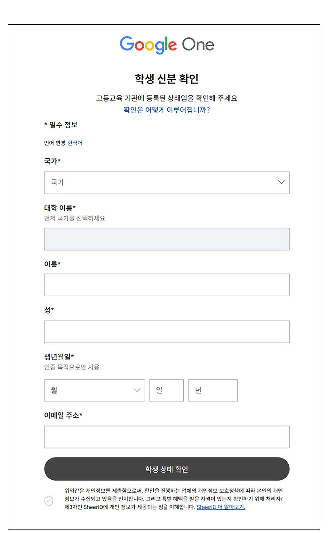 '자격 요건 확인' 버튼을 누르면 신분 확인 페이지로 넘어가게 된다. 자신의 이름과 생년월일, 소속 학교 이메일 주소를 입력하면 되는데, 학교명은 개인 정보를 입력하면 자동으로 매칭되는 방식이다.
