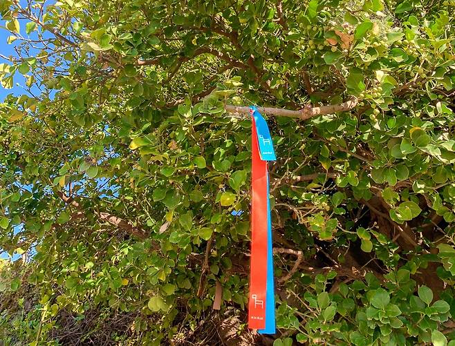 해안 누리길에서 볼 수 있는 올레길 리본, 코스마다 간세 또는 화살표로도 길을 확인할 수 있습니다.