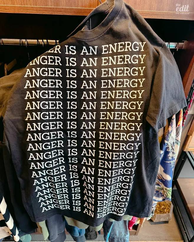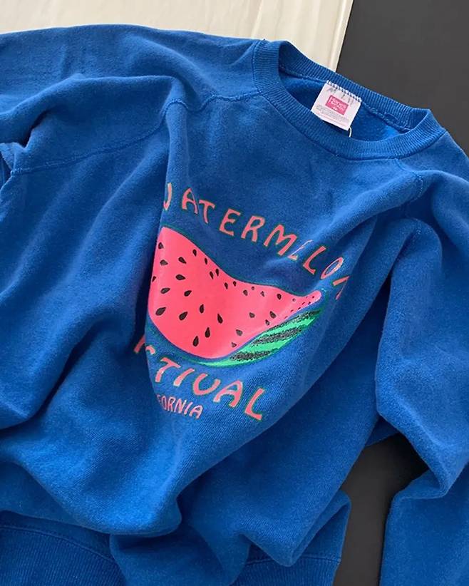 마지막으로 주목할 것은 리폼 티셔츠다. 필름이 들어있는 걸 모르고 사진을 한 번 더 찍어서 필름 한 롤 전체를 망한 적이 있다. 그런데 오히려 두 가지 장면이 겹치면서 실재하지 않는 풍경이 만들어진 게 마음에 든 적이 있는데, 이 리폼 옷들이 그렇다. 수박과 딸기 같은 과일 일러스트와 영어 단어를 옷의 중앙 부분에 쾅쾅 박은 게 인상적인데, 기존에 있는 프린팅 위에 바로 덧바른 기세가 남다르다. 안 그래도 희귀한 빈티지에 한 겹 더 얹으니 정말 이 세상에 하나뿐이겠군, 절로 고개가 끄덕여진다.