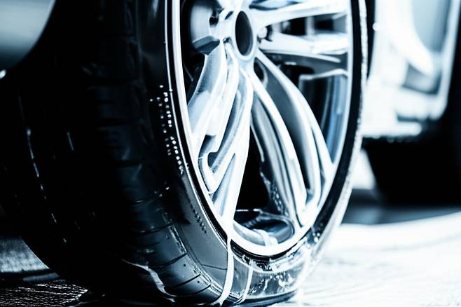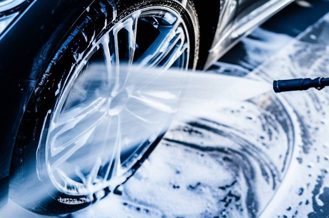 7. 물로 헹구기: 휠에 남아있는 클리너를 깨끗하게 헹궈냅니다. 고압 세척기를 사용하면 더욱 효과적으로 헹굴 수 있습니다.