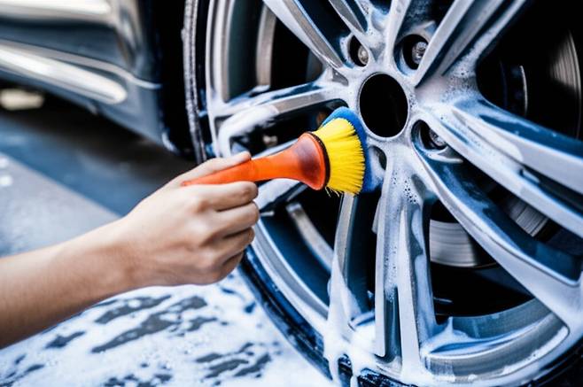 5. 휠 브러쉬로 닦기: 휠 브러쉬를 사용하여 휠 구석구석을 꼼꼼하게 닦습니다. 특히, 브레이크 분진이 많이 쌓이는 부분에 신경 써서 닦아주세요.