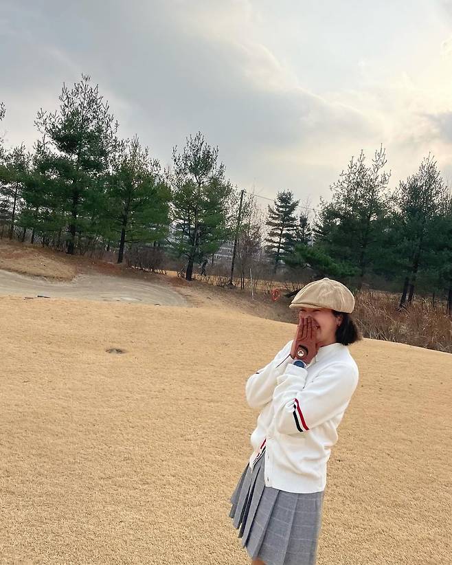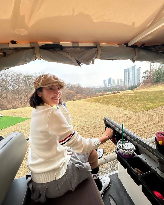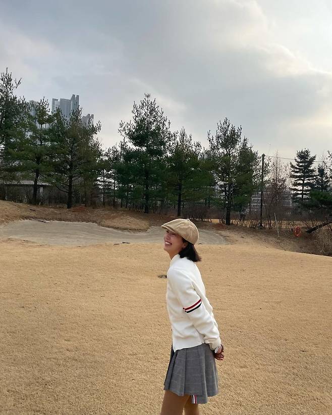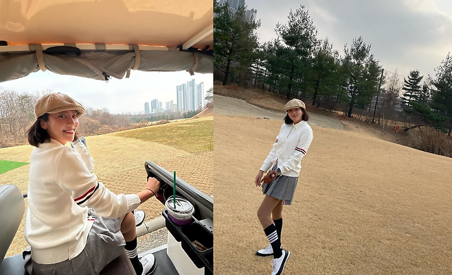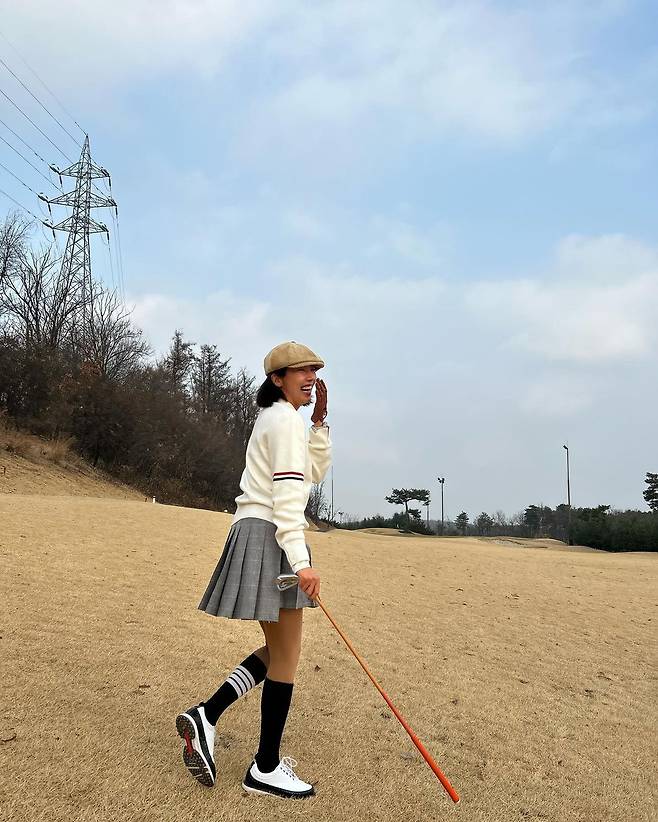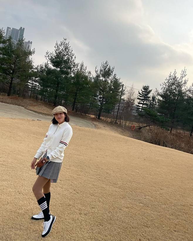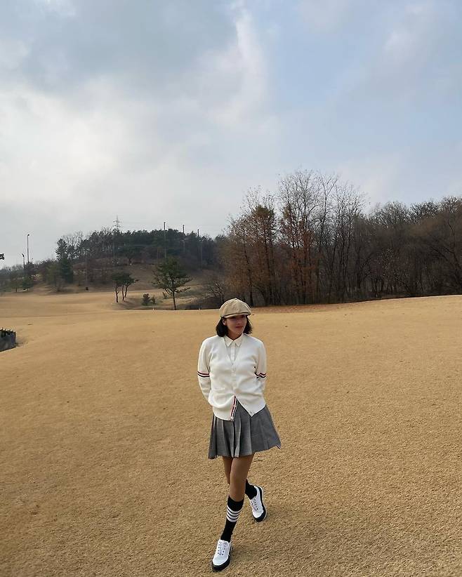 사진 속 손담비는 흰색 가디건과 체크 미니스커트를 입고 블랙 롱삭스와 베레모를 매치하여 센스있는 골프웨어 코디을 선보였다.