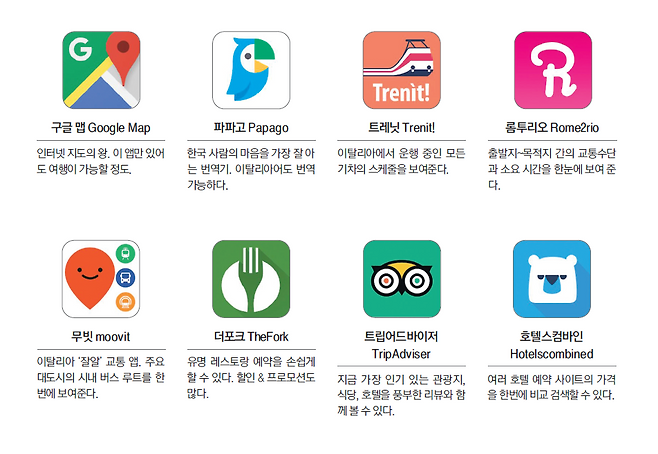 파파고와 트립 어드 바이저, 트레닛은 필수로 다운로드 받으셔야 합니다. 트레닛은 이탈리아의 열차 트레니탈리아와 이탈로의 모든 고속철도는 물론 일반 철도 및 지방 철도까지 검색이 가능합니다.