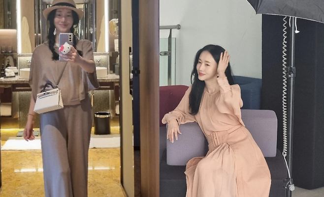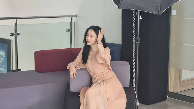 촬영 현장에서는 베이지 컬러의 A라인 원피스로 우아함을 표현하고 있다. 넉넉한 소매와 허리 벨트 디테일이 돋보이는 이 룩은 여성스러운 실루엣을 살리면서도 편안함을 동시에 추구한 스타일링을 보여준다. 자연스럽게 내려뜨린 긴 머리와 함께 차분하고 단정한 이미지를 연출하고 있다.