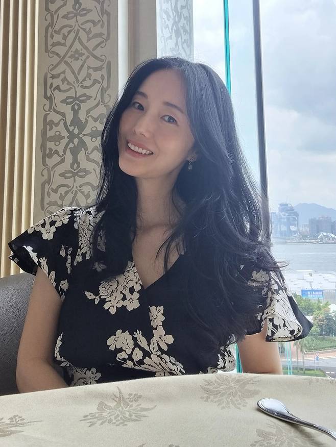 카페에서는 블랙 바탕에 화이트 플로럴 패턴이 돋보이는 블라우스를 착용해 로맨틱한 매력을 발산하고 있다. V넥 라인과 퍼프 슬리브 디테일이 여성스러운 분위기를 한층 더해주며, 자연광 아래에서 웨이브 헤어와 조화를 이루며 우아하고 세련된 룩을 완성하고 있다.