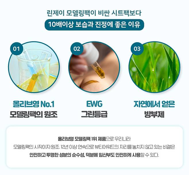 린제이 모델링팩은 우리나라 모델링팩의 원조제품으로 이후로 다양한 모델링팩이 우후죽순 출시됐지만, 12년 이상 연속 뷰티 어워드 1위 자리를 굳건히 지키고 있는 올리브영1위 모델링팩이다.