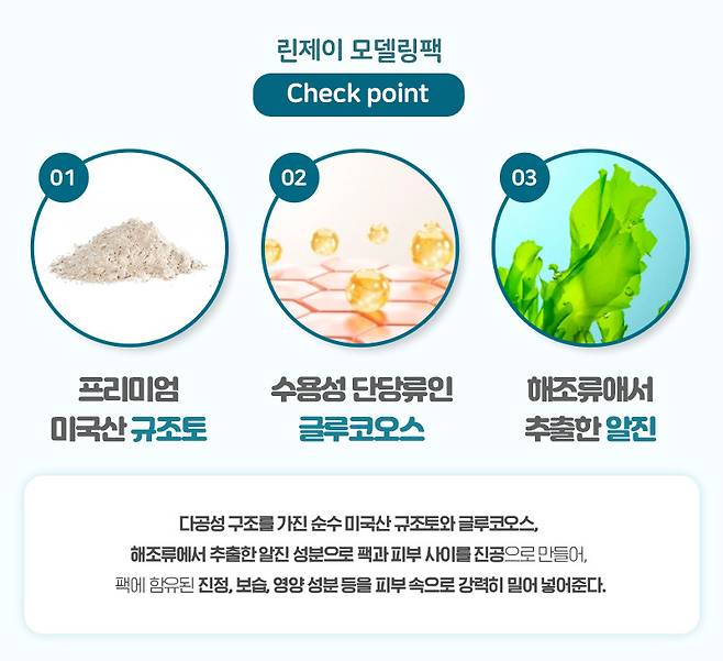 올리브영 1위 모델링팩, 린제이 모델링팩은 피부 진정과 보습에 효과적인 순수 미국산 규조토, 글루코오스, 해조류에 추출한 알진 세 가지 주요 성분의 시너지가 특징이다. 이 세가지 성분의 시너지로 팩에 함유된 진정, 보습, 영양 성분이 피부 속으로 강력히 흡수되도록 도와주기 때문.
