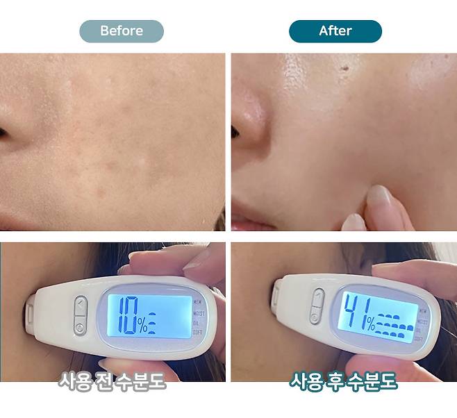 특히 환절기임에도 피부가 상당히 촉촉하고 탄탄해졌는데, 수분측정기로 체크했을 때 사용 전 후로 무려 4배나 수분감이 올라간 것을 수치로도 확인할 수 있었다. 지친 피부에 생기 가득!