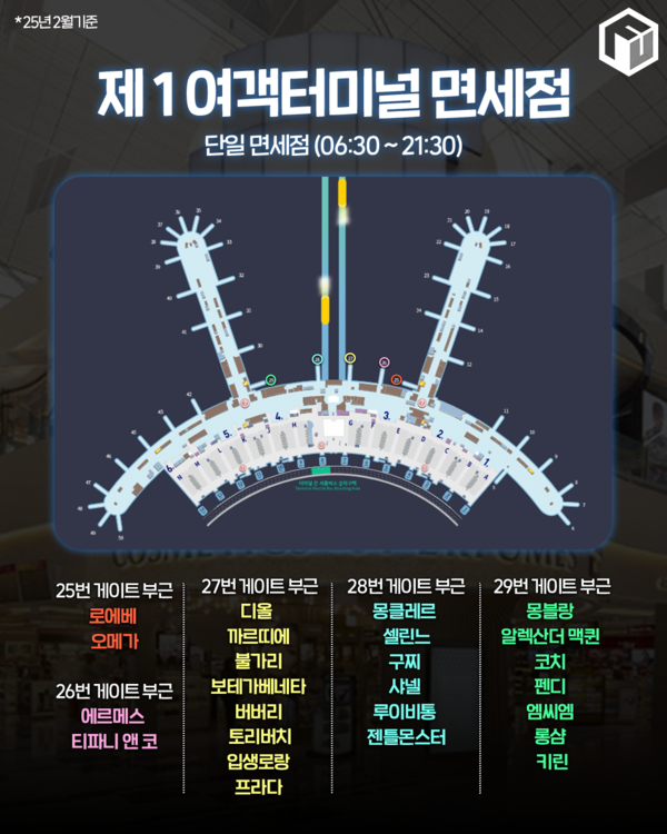명품 면세점은 25번 ,26번, 27번, 28번, 29번 게이트 부근에 몰려 있어 특별한 목적이 아닌 명품 브랜드 아이쇼핑을 하고싶으시다면 25번 게이트부터 29번 게이트까지 순차적으로 둘러보시면 좋습니다.