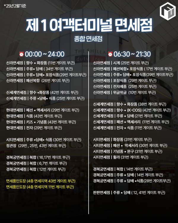 제 1터미널 내에 위치한 종합 면세점은 신라, 신세계, 현대, 시티, 경복궁, 판판 면세점이 있습니다. 면세점별 판매 품목이 다르며 영업 시간도 24시간 운영, 새벽 6시 30분부터 오후 9시 30분까지 달라 꼭 확인 후 방문하셔야합니다.
