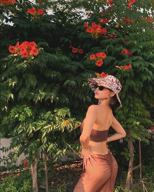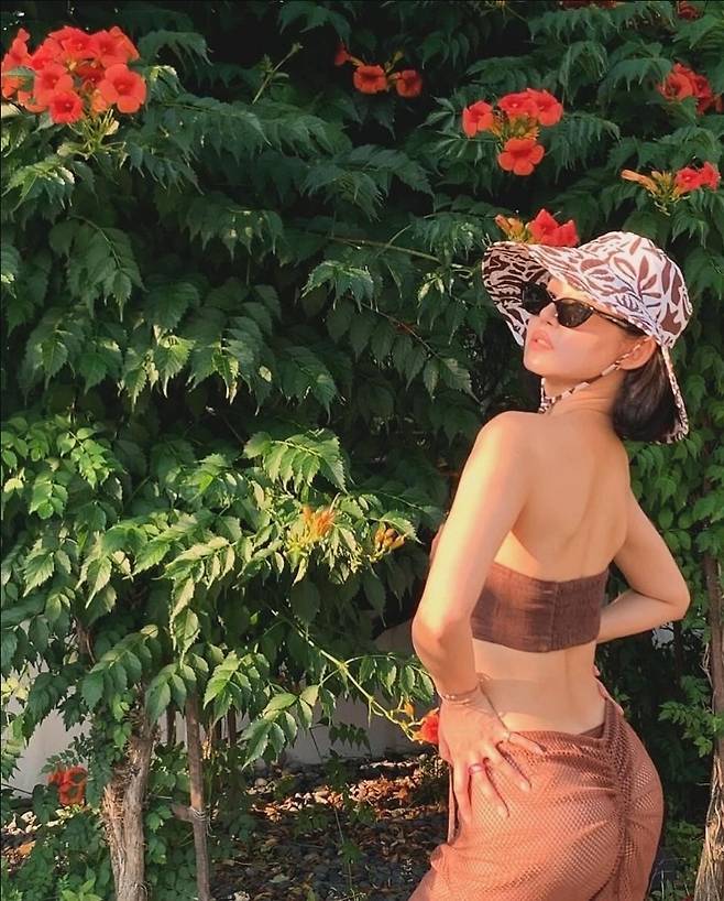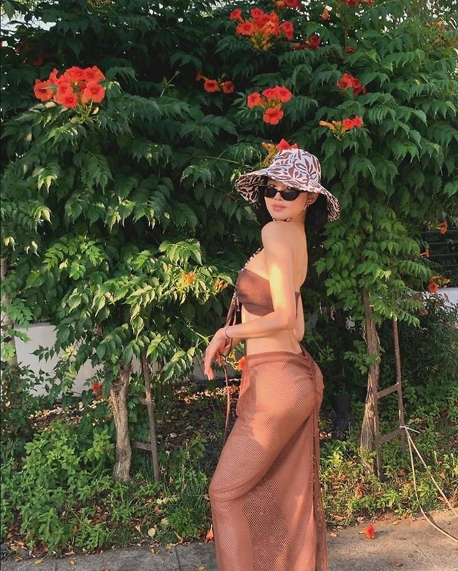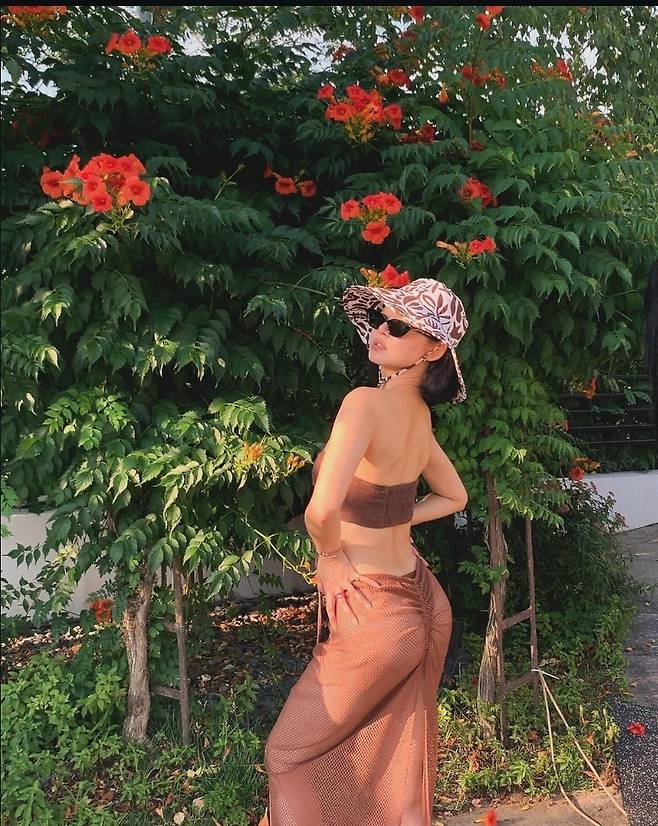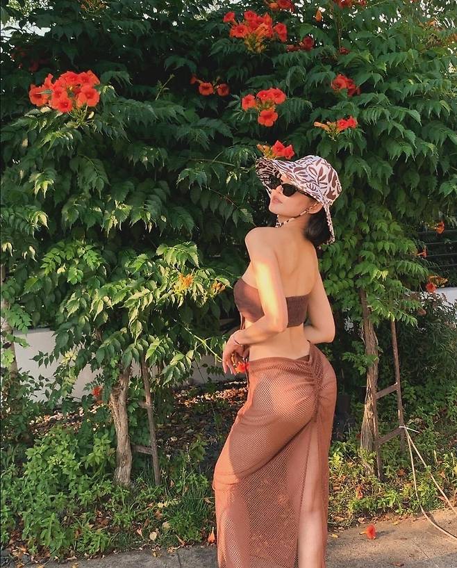 황승언은 브라운 스윔웨어를 착용해 우아하고 시원한 분위기를자아냈습니다.