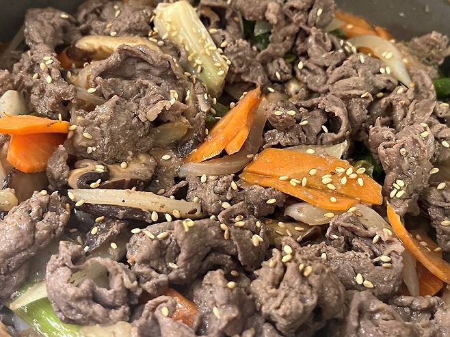 고기가 다 익으면 불을 끄고 참기름 1스푼 둘러 주세요. 통깨까지 뿌리면 고소함이 더욱 살아납니다. 이렇게만 양념해서 드시면 실패 없는 불고기가 완성됩니다.