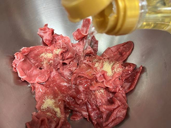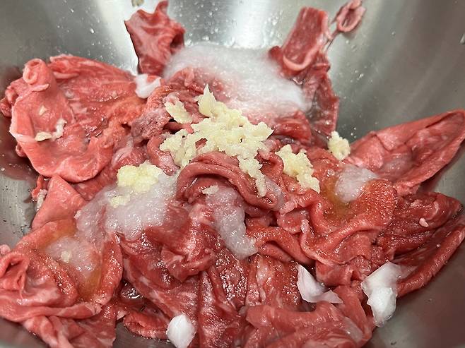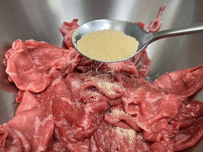 고기에 밑간을 합니다. 고기 양념할 때는 설탕을 가장 먼저 넣으세요. 설탕을 넣으면 단맛이 잘 스며들고 고기 조직이 연해져서 다른 양념들도 흡수력이 좋아집니다.