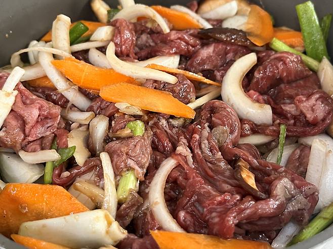 고기에 야채까지 넣은 다음 잘 섞어서 양념에 재료를 재웁니다. 고기가 얇은 경우 양념을 재우고 바로 구워 먹어도 간이 잘 뱁니다.