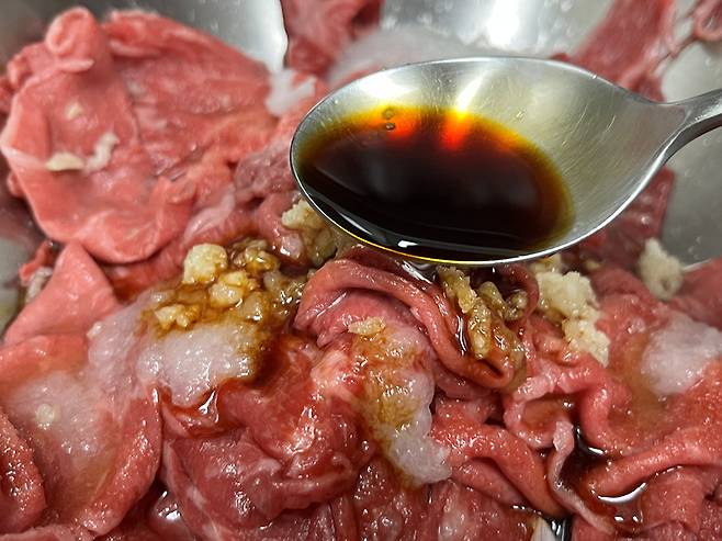 맛술은 2스푼 넣습니다. 맛술이 없다면 소주나 청주로 대체하세요. 고기 특유의 잡내는 효과적으로 잡아주며 맛술은 은은한 단맛을 냅니다.