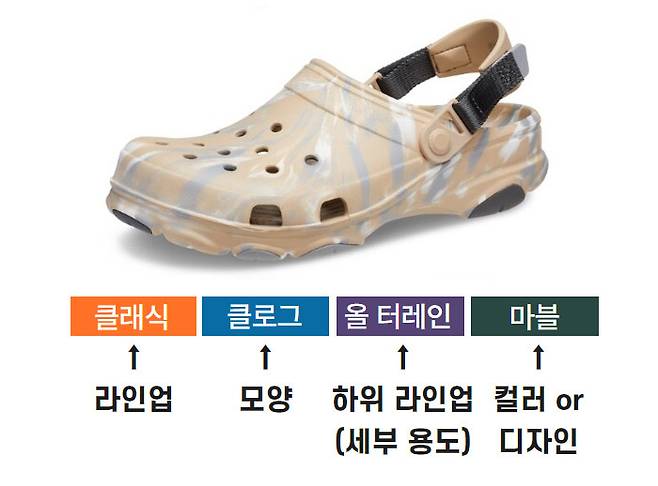 제품 고유의 컬러, 디자인적 특징이 또 붙을 수 있다. [크록스 클래식 클로그 올 터레인 마블]은 클래식 라인업의 클로그 타입 신발이며, 모든 환경에서 사용할 수 있고 제품의 컬러가 마블, 즉 대리석처럼 마감되었다는 말이다. 크록스는 명성답게 컬러와 고유 디자인이 셀 수도 없이 많기 때문에 이런 포인트를 제품명에 명기해 쇼핑에 도움을 주는 것이다. 마블 외에도 카모플라쥬(군복), 그래스(잔디), 래번크로(호크와트의 기숙사 중 하나) 등 기본 컬러는 물론이고 드래곤볼Z, 건담, 심슨 가족 등 다양한 문화 콘텐츠와 콜라보한 특징도 명기되니 크록스 신발을 살 때 꼼꼼히 체크하자.