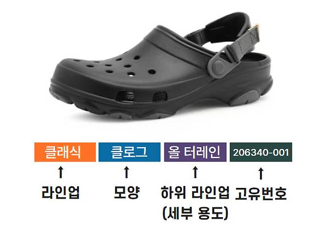 용도에 따른 분류도 추가될 수 있다. [크록스 클래식 올 터레인 클로그 206340-001]<실시간 31,150원>은 앞서 설명한 가장 기본적인 제품명에 '올 터레인'이라는 하위 라인업이 추가된 제품이다. 크록스는 의료, 캠핑, 수중 등 정말 다양한 환경에서 활용되기 때문에 이렇게 모델명에 별도로 표기하는 경우도 많다. 뒤에 자세히 설명하겠지만, 예시로 든 올 터레인은 All-Terrain, 즉 거의 모든 환경에서 활용이 가능하다는 의미다.