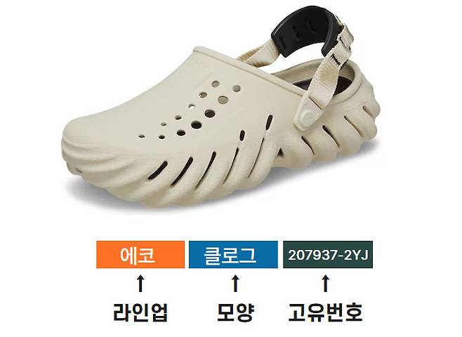 크록스 전체 제품들의 모델명을 꿰뚫는 규칙이 존재한다. 이 규칙을 인지하고 있으면 모델명만 봐도 제품의 모양, 특징 등을 쉽게 파악할 수 있다. 가령 [크록스 에코 클로그 207937-2YJ]<실시간 49,200원>라는 제품을 보자. 크록스 다음에 나오는 [에코]는 제품 라인업의 이름이다. 마지막으로 나오는 클로그는 앞서 살펴본 것처럼 신발의 모양을 뜻한다. 맨 뒤 숫자 조합은 제품의 고유 번호를 의미한다. 이렇게 크록스-라인업-모양-고유번호가 나오는 제품명이 크록스 제품 중 가장 기본 중 기본이라 하겠다.