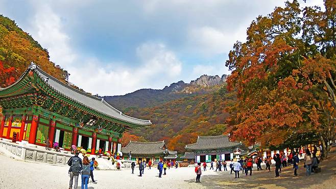 본래 ‘내장사’로 불렸던 이 사찰은 1300여 년 전 창건된 유서 깊은 고찰로, 케이블카를 타지 않고서는 쉽게 보기 힘든 장면이다.