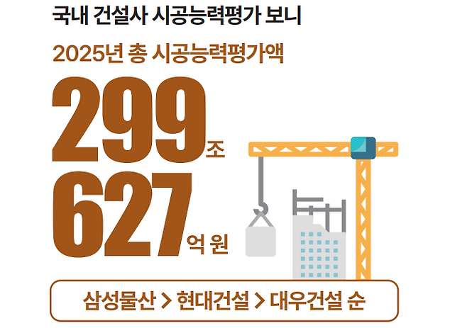 국내 토목건축업체들의 시공능력평가액 합계가 2023년 273조 5624억 원, 2024년 294조 771억 원에 이어 올해 299조 627억 원으로 집계돼 상승세를 이어가고 있는 것으로 나타났습니다. 국토교통부는 7월 31일 7만 3657개 건설업체를 대상으로 실시한 ‘2025년도 시공능력평가’ 결과를 공시했습니다.