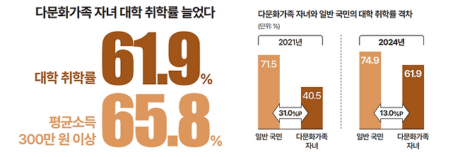 2024년 국내 다문화가족 자녀의 대학 취학률이 61.9%를 기록해 40.5%였던 2021년보다 21.4%포인트(P) 상승한 것으로 나타났습니다. 여성가족부가 전국 다문화가족 1만 6014가구를 대상으로 실시한 ‘2024년 전국 다문화가족 실태조사’ 결과에 따르면 다문화가족 자녀와 일반 국민의 대학 취학률 격차가 2021년 31.0%P에서 2024년 13.0%P로 좁혀졌습니다. 4년제 이상 대학 진학을 희망하는 만 9~24세 다문화가족 자녀 비율도 71.6%로, 60.7%였던 2021년 대비 눈에 띄게 늘었습니다. 최근 1년간 학교폭력을 경험한 비율은 2021년 2.3%에서 2024년 1.9%로 하락했습니다. 이에 대해 여가부는 “2000년대 초중반 출생한 다문화가족 자녀들이 정부의 정책과 지원제도 확대 효과를 체감하는 시기와 맞물린 결과”라고 분석했습니다.