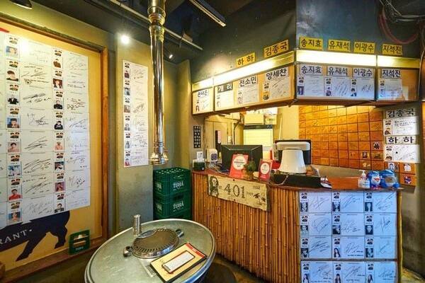 마포 고기집 중에서도 ‘연예인 운영’이라는 재미 요소를 더한 곳, 401 정육식당인데요. 예능 프로그램 ‘런닝맨’ 멤버 하하와 김종국이 운영하는 401 정육식당은 고기 맛은 물론이고 분위기까지 정겹습니다.