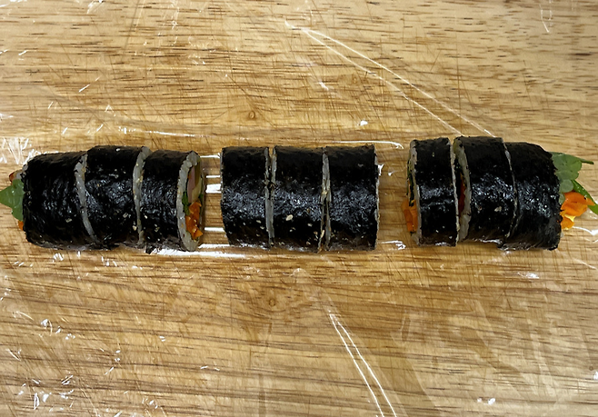 이때, 1줄을 그냥 랩에 한꺼번에 감싸지 말고 3~4개씩 띄어서 포장하세요. 김밥 사이에 약간의 공간을 두면 서로 붙지 않고, 해동할 때에도 모양이 흐트러지지 않습니다.