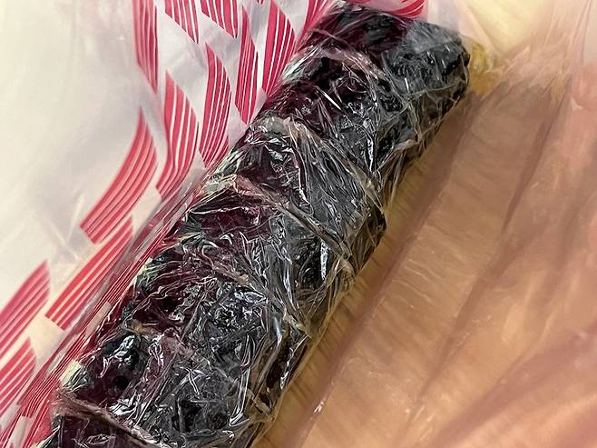 그다음 지퍼백에 넣고 공기를 최대한 빼서 밀봉합니다. 이렇게 하면 냉동실 냄새가 배지 않고, 김밥 속 수분이 빠져나가는 것도 막을 수 있습니다.