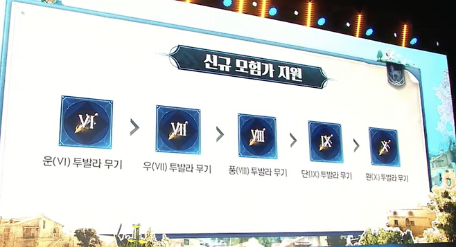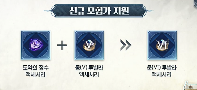 신규 모험가들의 장비 성장을 위한 보조 장치 또한 마련된다. 졸업 시 ‘도약의 정수 - 무기’, ‘도약의 정수 - 액세서리’를 제공하며, 동(V) 투발라 무기에 도약의 정수를 사용해 ‘운(VI)’ 등급으로 전환할 수 있다. 해당 장비를 ‘환(X)’ 등급까지 강화하면 ‘동(V) 검은별 무기까지 얻을 수 있다. 단, 해당 장비는 거래소 등록이 불가하다.