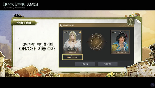한편, 캐릭터 전이도 개편된다. 전이 태릭터의 동기화 버튼을 활성화/비활성화 하면 두 캐릭터를 다른 곳에서 사용할 수 있다. 다시 같이다니기를 할 때는 두 캐릭터가 같은 곳에 있어야 가능하다. 전이에 필요한 마르니의 불완정한 연료도 1/10 로 줄어든다.