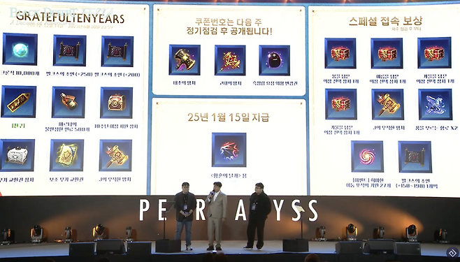 스페셜 접속 보상도 진행된다. 각 계절 의상 선택상자와 J의 우직한 망치, 발크스의 조언 등을 추가로 획득할 수 있다. 다음주 점검부터 시작해 획득할 수 있다. 쿠폰 번호 GRATEFULTENYEARS를 입력해 위 아이템 일부를 획득할 수 있으며, 그 외 아이템의 획득 가능 시기는 아래 사진과 같다.