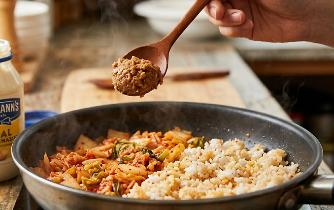 그럴 때 의외의 재료 두 가지만 추가하면 김치볶음밥의 풍미가 완전히 달라집니다. 바로 된장과 마요네즈입니다. 처음 들으면 어울리지 않을 것 같지만, 실제로 넣어보면 감칠맛과 고소함이 더해져 훨씬 깊은 맛을 만들어 줍니다.