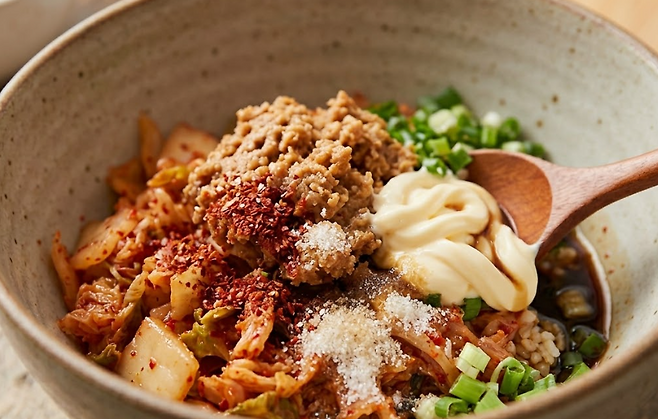 평소 만들던 김치볶음밥이 조금 지루하게 느껴진다면, 다음 번에는 된장과 마요네즈를 한 번 넣어보셔도 좋겠습니다.