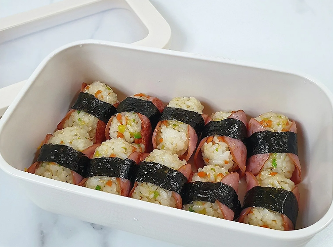 도시락을 만들고 이동 중에 모양이 흐트러질까 봐 걱정이신 분들은 주먹밥처럼 모든 재료를 넣고 네모 모양을 만들어서 테두리에 띠만 둘러 가도 좋습니다.