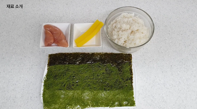 5) 감태와 김을 1센티 간격으로 잘라서 준비하고 밥을 네모 모양으로 잡아서 테두리에 띠를 감아서 준비합니다.
