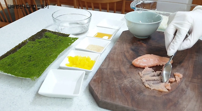 3) 명란젓은 반을 잘라서 알 부분만 긁어서 담아줍니다.