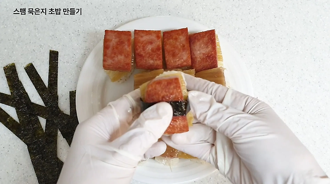 9) 김 띠를 스팸이 위에 있는 초밥에만 둘러서 마무리합니다.