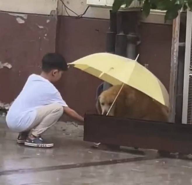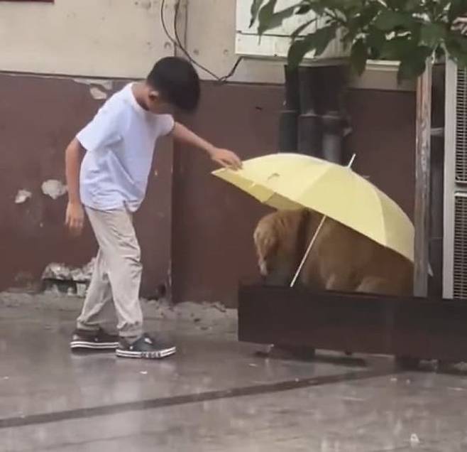 비를 미처 피하지 못해서 온몸이 흠뻑 젖은 유기견에게 자신이 쓰고 있던 우산을 기꺼이 양보하고 씌워주는 어린 소년의 모습은 보는 이들에게 잔잔한 감동을 주고 있는데요.