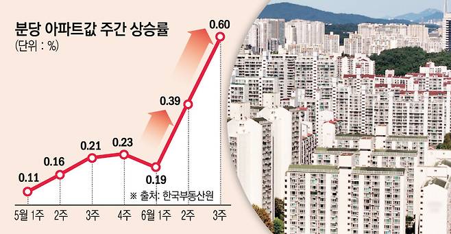 분당 아파트값은 올해 들어 꾸준히 오름세를 보였는데 특히 6월 들어 상승 폭이 더 커졌다. 6월 첫째 주는 0.19%, 둘째 주는 0.39%, 셋째 주는 0.6%로 점점 가팔라지고 있다.