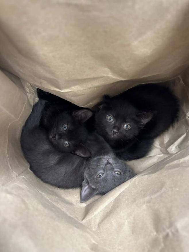 남성이 조심스럽게 봉투를 열자 그 안에서 어린 새끼 고양이 세 마리가 얼굴을 내밀었다.