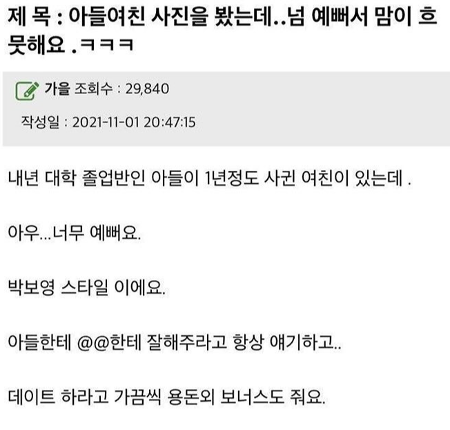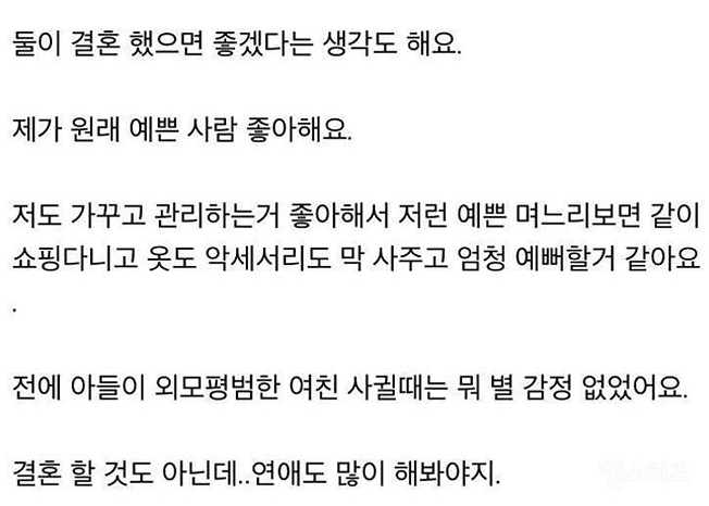 아들 여친이 예쁘게 생겨서 좋다는 어머니