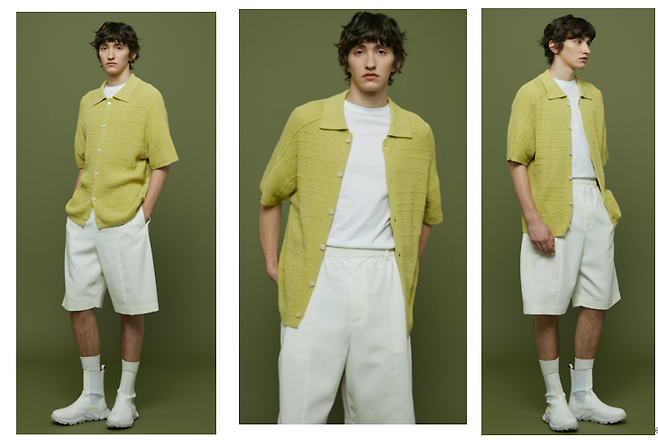 가볍고 청량한 느낌과 고급스러운 분위기를 표현할 수 있는 반팔 가디건과 반바지를 활용한 코디입니다. 자연스럽고 고급스러운 느낌을 줄 수 있으며 버튼 클로징 및 오픈 시 다양한 연출을 할 수 있습니다. 여기서 포인트는 통기성이 우수한 재질의 반팔 가디건이여야 하고, 세미 오버핏으로 입어주어야 한다는 점입니다!