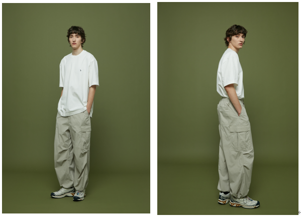 과하지 않고 오묘한 조직감이 고급스러움을 전달해주는 반팔 셔츠와 비슷한 느낌의 카고팬츠를 활용한 코디입니다. 미니멀한 스트릿 느낌을 연출할 수 있습니다. 여기서 포인트는 쾌적한 터치 소재의 셔츠와 팬츠여야 한다는 점입니다. 세미 오버핏을 추천하고 셋업으로 착용해야 효과적인 느낌을 줄 수 있습니다!