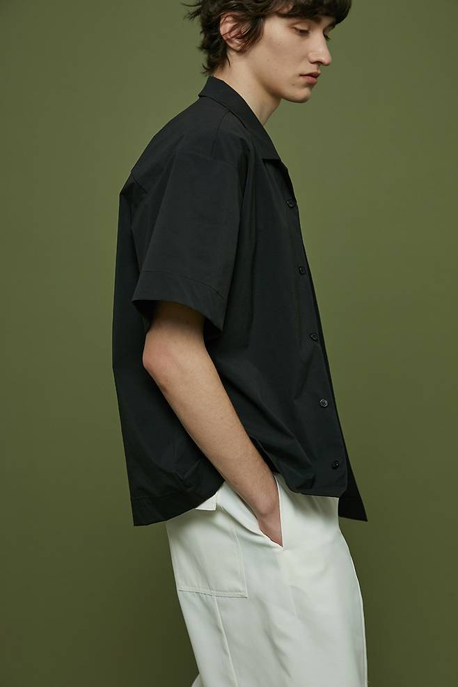 유니크한 페이퍼리 소재 사용, 미니멀한 오픈카라 하프셔츠