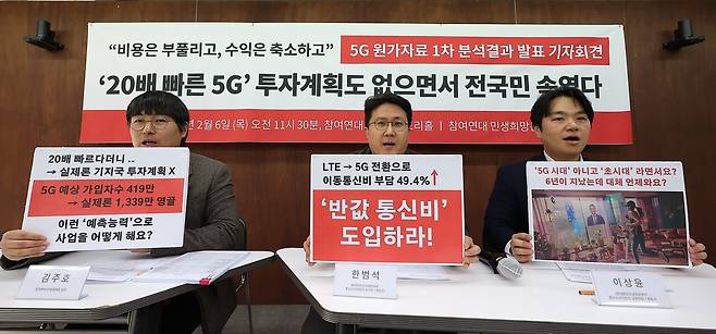 참여연대 민생희망본부는 6일 종로구 참여연대 아름드리홀에서 기자회견을 열고 정보공개 소송을 통해 확보한 2019년 SK텔레콤 5G 인가 신청 및 요금 산정 근거 자료의 1차 분석 결과를 발표했다.